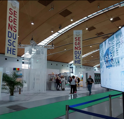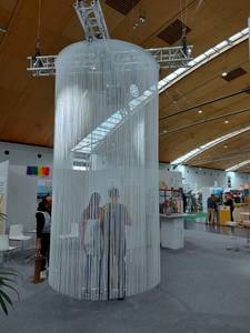 Herzstück des kirchlichen Pavillons in Halle 1 (Stand D.05) war wieder einmal die Segensdusche des ökumenischen Citykirchenteams um Pfarrer Dirk Keller und Achim Kaltwasser. Und so funktionierte die Segensdusche: Anstelle des üblichen Wassers floss ein Licht von oben über die duschende Person.