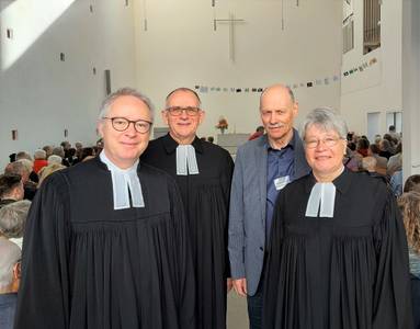Der Gottesdienst begann mit einer Live-Schalte per Video in die Evangelische Kirche nach Knielingen, wo Pfarrer Siegfried Weber im Namen der „Kooperationsgemeinde“ herzlich grüßte. Dann folgte der musikalisch reihhaltige Gottesdienst, in der Dekan Dr. Thomas Schalla dem scheidenden Pfarrer für seinen Dienst in der Gemeinde und in der Evangelischen Kirche in Karlsruhe dankte und ihn aus seinem Dienst entpflichtete. Dem Sonntag „Misericordias Domini“ gemäß erinnerte der Dekan an die Barmherzigkeit Gottes, unter der auch das Wirken von Pfarrer Scharf in der Nordweststadt zum Wohle der Gemeinde stand.