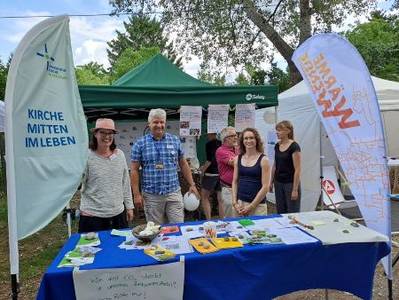 Auf Süddeutschlands größtem Familienfestival „Das FEST“ vom 20.-23. Juli 2023 in der Karlsruher Günther-Klotz-Anlage gab es neben hochkarätiger Musik auf vier Bühnen und jeder Menge Spiel und Spaß auch eine Info-Meile, auf der sich unter anderem die Evangelische Kirche in Karlsruhe mit der synodalen AG Umwelt präsentierte. Auf dem gemeinsamen Stand des Karlsruher Klimabündnisses, dessen Teil die Evangelische Kirche ist, gab es Informationen zum Kirchlichen Umweltmanagement „Grüner Gockel“ sowie dem erst in diesem Jahr verabschiedeten Klimaschutzgesetzt der Badischen Landeskirche.
