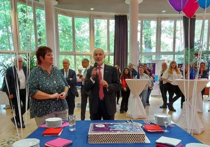 Beatrix Wieß, Vorstandsvorsitzende des Aufsichtsrats des Diakonisches Werks, Diakoniedirektor Wolfgang Stoll beim Festempfang zu 100 Jahre Diakonie Karlsruhe