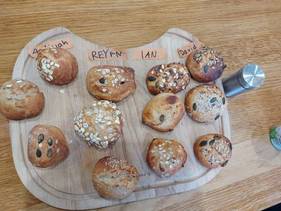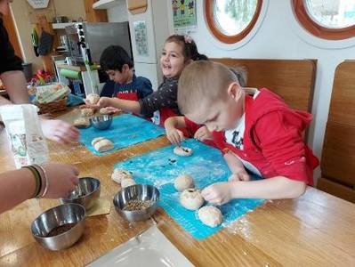In dieser Woche werden Vollkornbrötchen gebacken. Dampfend heiß warten die mit Kürbiskernen verzierten Brötchen darauf, von den Kindern verspeist zu werden, als sie aus dem Backofen der mobilen KiKoMo-Küche kommen. Verziert mit Kräuterquark, Bio-Käse oder Butter schmecken sie so richtig gut. Es ist ein tolles Erlebnis für die Kinder.