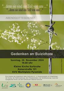 In Karlsruhe Stadt und Landkreis nehmen sich Jahr für Jahr um die 90 Menschen das Leben. In dem Abendgottesdienst am 24. November um 19 Uhr in der Kleinen Kirche soll Raum und Zeit sein, gemeinsam an sie zu denken und um sie zu trauern.