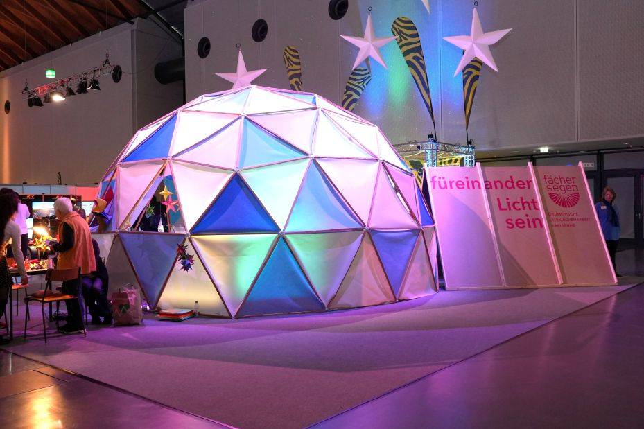 Die evangelische und katholische Kirche war in diesem Jahr erneut mit einem Stand des Ökumenischen Fächersegens vertreten. Als das Team hörte, dass Sie ihren Stand in diesem besonderen Ambiente in der Signature Hall haben würden, war ihnen klar, dass sie dieses Thema von Licht und Schatten aufgreifen möchten, sagte Max Kosoric, der für die künstlerische Umsetzung des Fächersegens-Standes verantwortlich zeichnete.